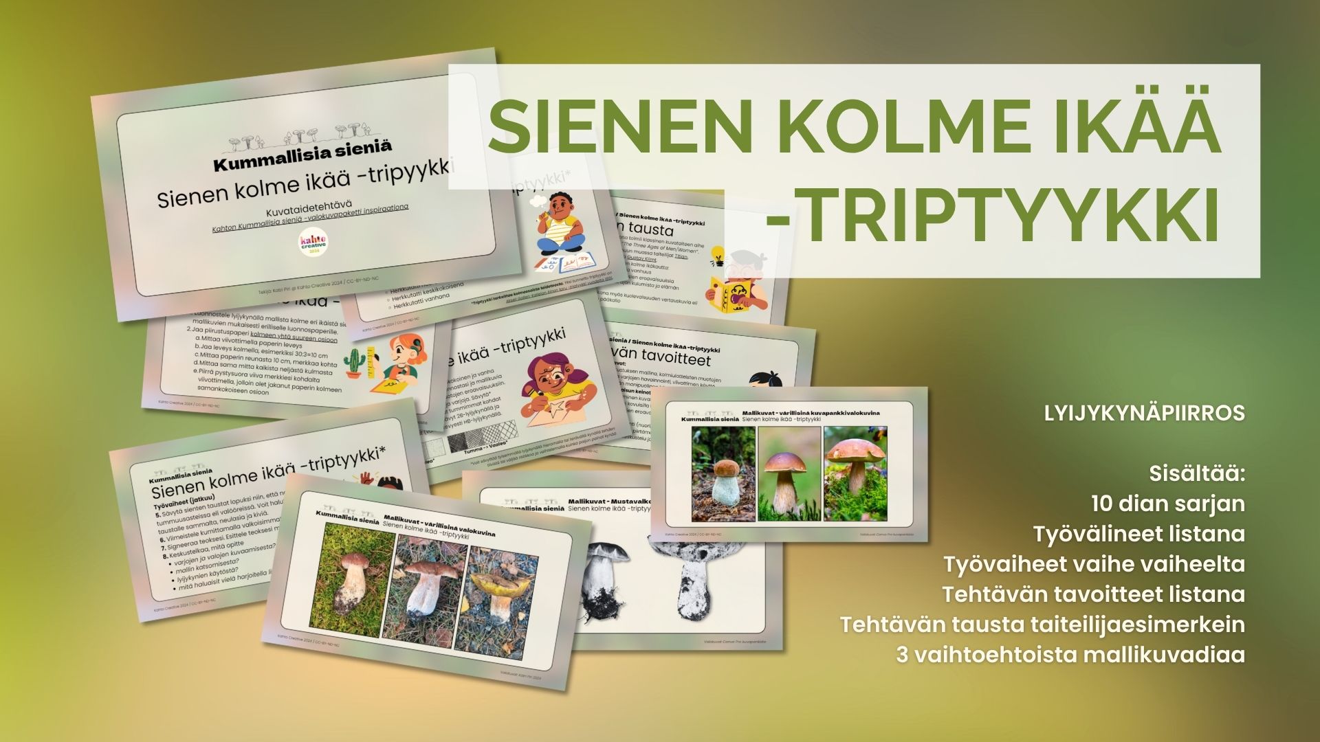 Kummallisia sieniä -paketti sisältää sekä valokuvapaketin että diasarjapaketin, jossa on kolme erilaista ja vaiheistetusti ohjattua kuvataidetehtävää.