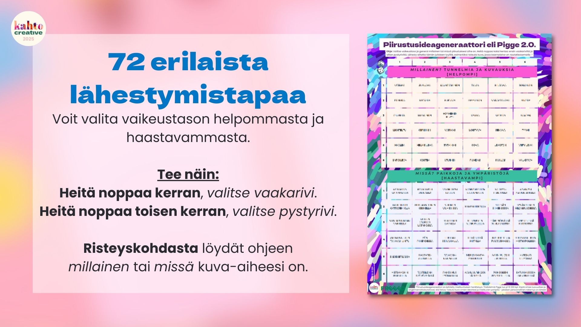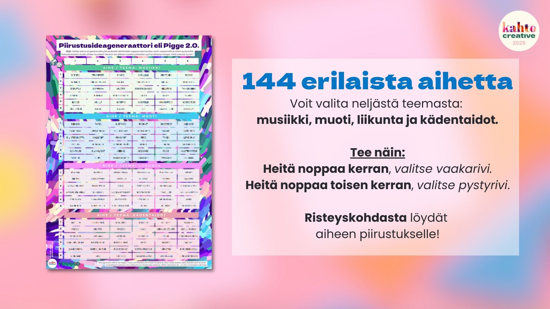 Piirustusideageneraattori Pigge 2.0. koostuu kahdesta A3-kokoon tulostettavasta julisteesta. Niiden avulla on mahdollista generoida eli luoda 144 x 72 eli yhteensä 10 368 erilaista piirustustehtävää koulussa ja kotona!