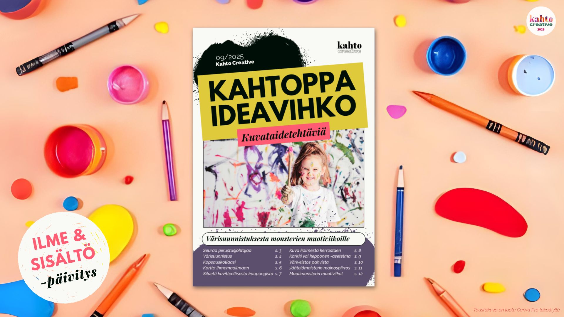 Tilaamalla tämän ilmaisen ideakirjeen, saat kaksi kertaa lukukaudessa ilmestyvän Kahtoppa -ideavihkon veloituksetta (arvo 8€/kpl). Digitaalinen Kahtoppa- ideavihko sisältää kymmenen kuvataidetehtäväideaa ohjeineen ja välinelistoineen.