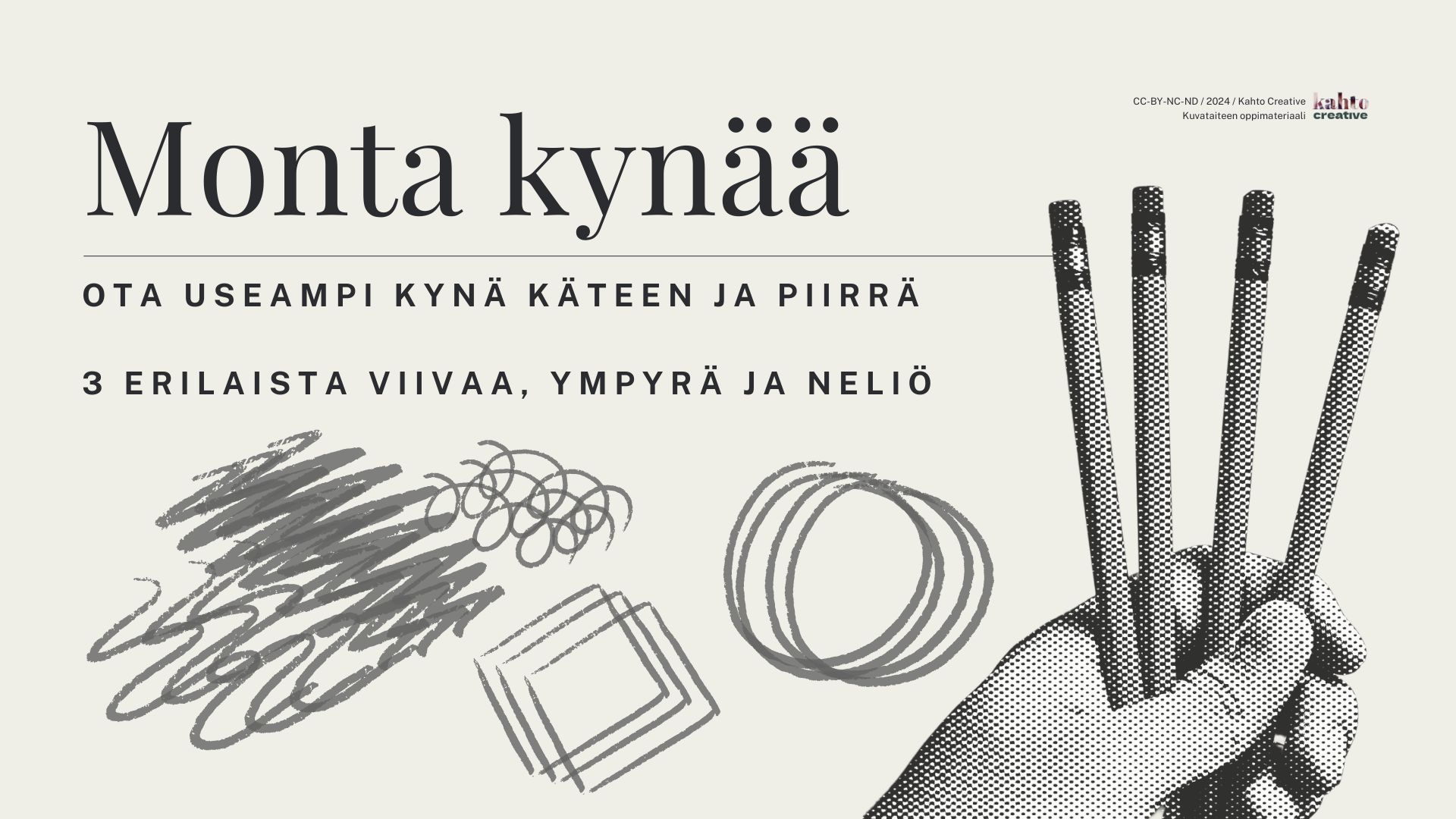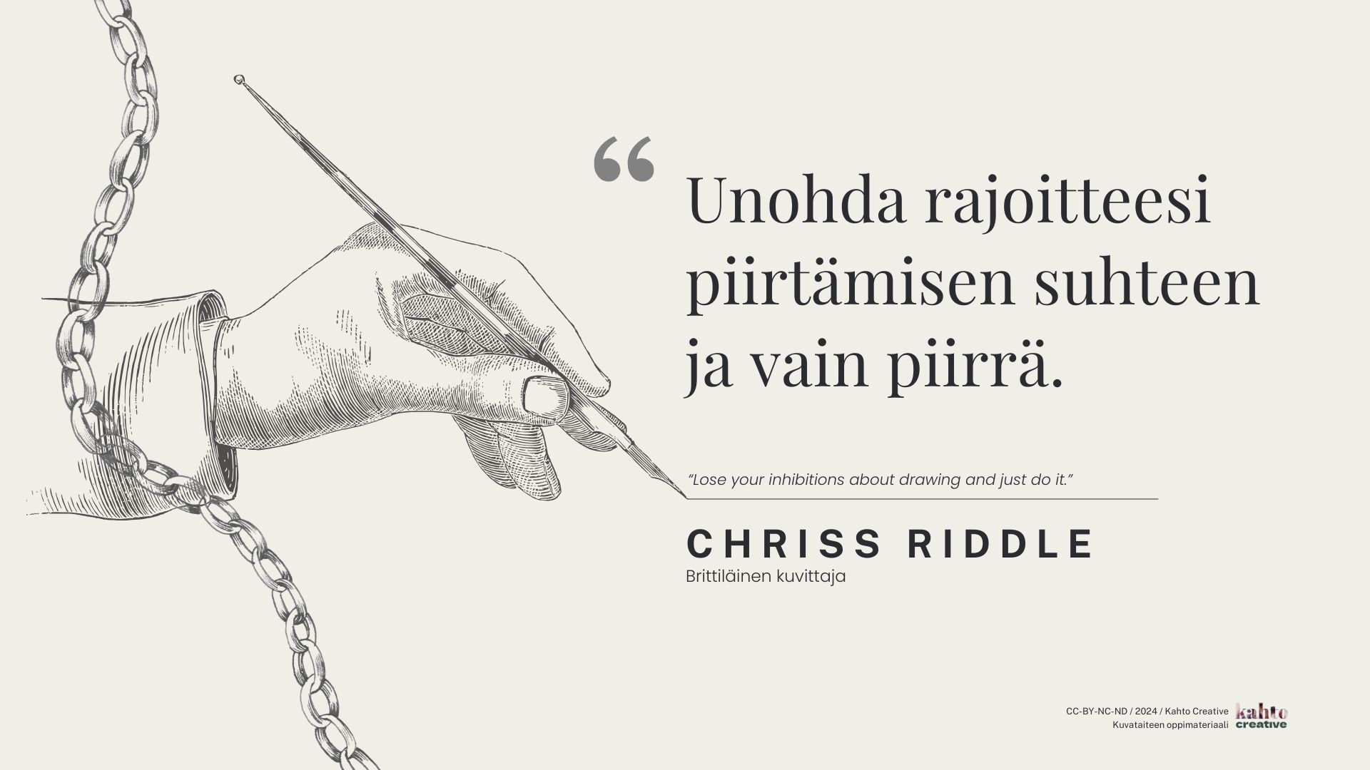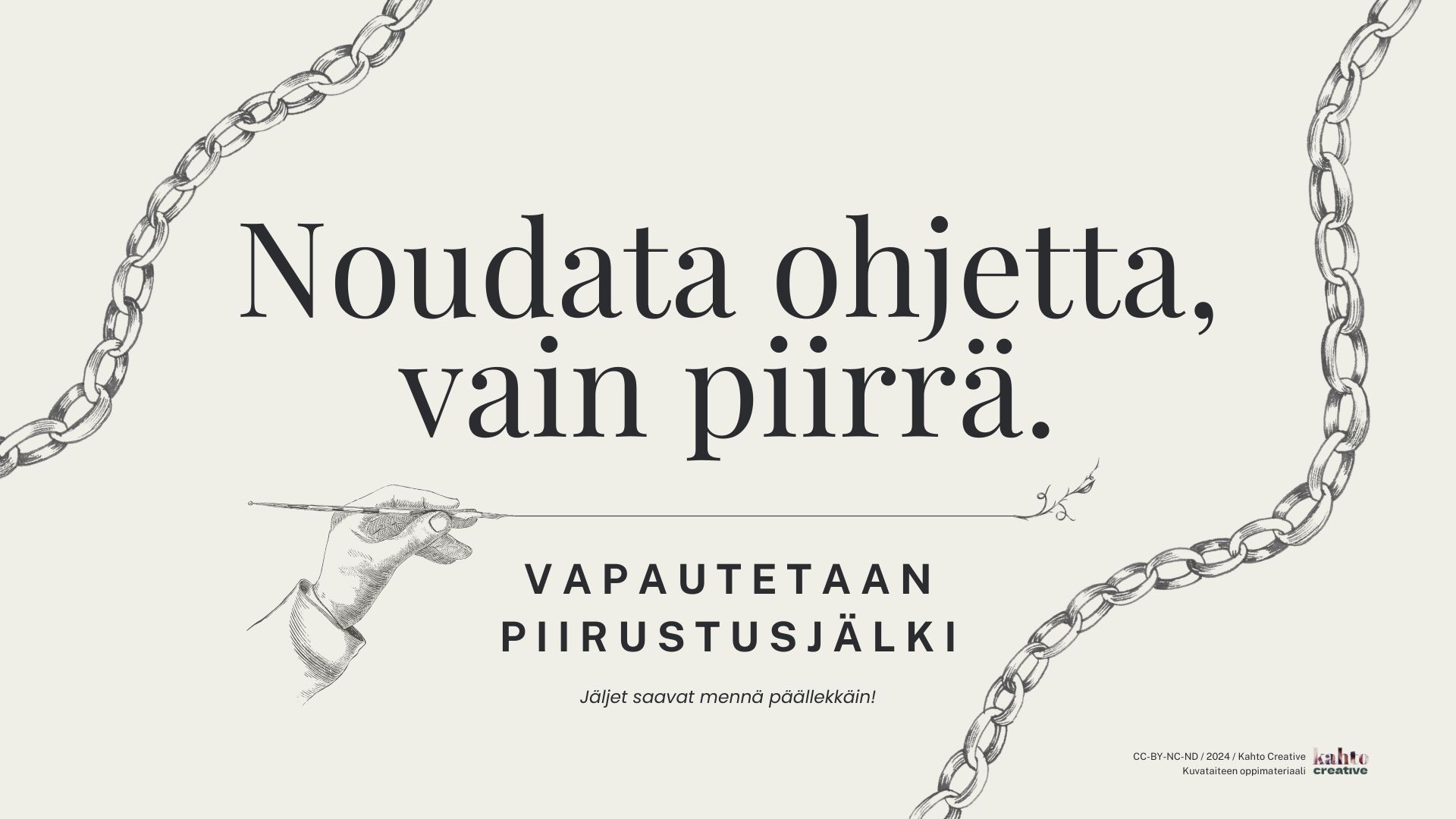Harjoitus sisältää sitaatteja kuuluisilta taiteilijoilta sekä yhteensä 26 erilaisiin piirtämisotteisiin perustuvaa harjoitetta tehtäväksi (lyijy)kynällä A3-kopiopaperille. Nyt piirretään vain viivoja, ympyröitä ja neliöitä - mutta hyvin monella erilaisella tavalla!