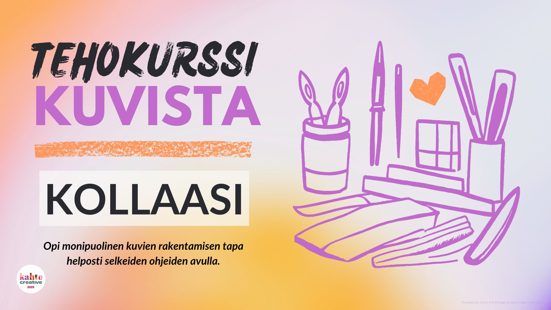 Kiinnostaako kuvien tekeminen rentoutuskeinona, mutta tuntuu, ettet osaa piirtää tai maalata? Kollaasi on monipuolinen kuvan tekemisen tapa, joka sopii ihan kaikille. Tällä tehokurssilla tutustut kollaasiin kuvataiteen tekniikkana ja toteutat neljä erilaista harjoitusteosta selkeiden ohjeiden mukaisesti mutta niin, että omat mieltymyksesi saavat näkyä!